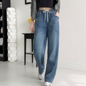 여성 뒷밴딩 커브드 벌룬 와이드 데님 팬츠