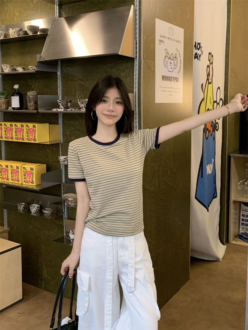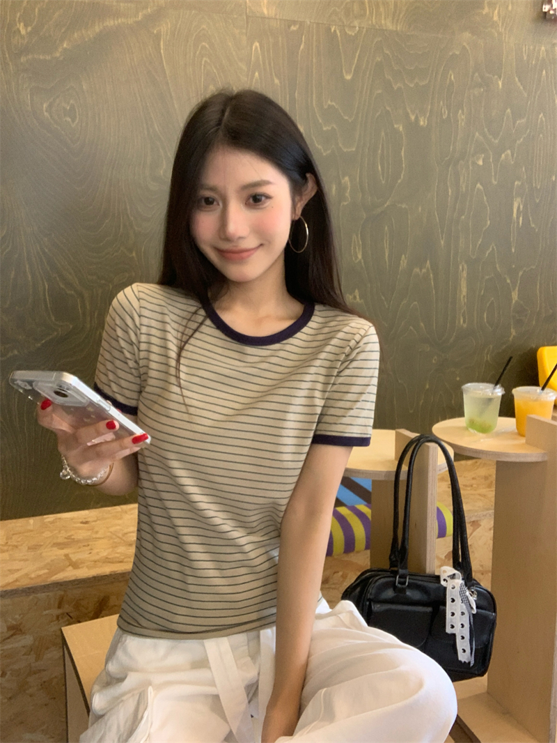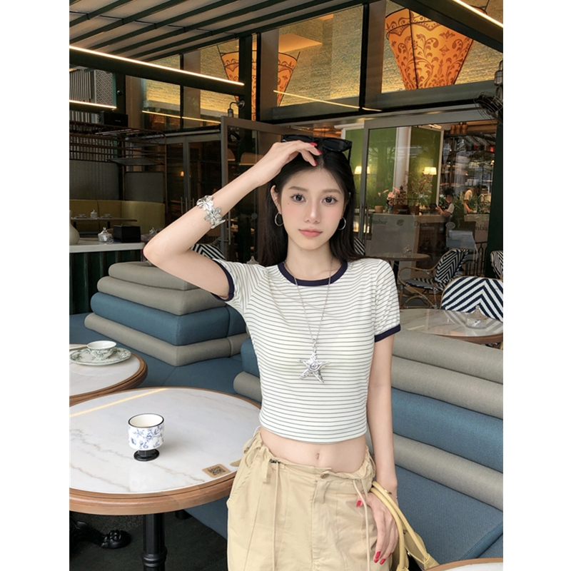 어깨 반팔 타이트 쇼트 스타일 스트라이프 티셔츠