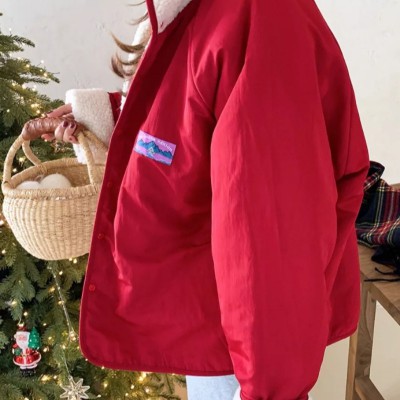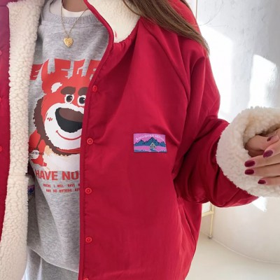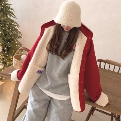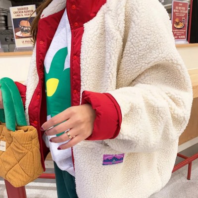 한국 스타일 겨울 과립 플러시 양면 착용 재킷 chic 디자인 센스 루즈핏 양털 레트로 빅 사이즈 배색 여성 코트