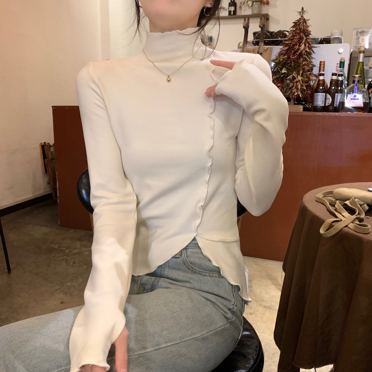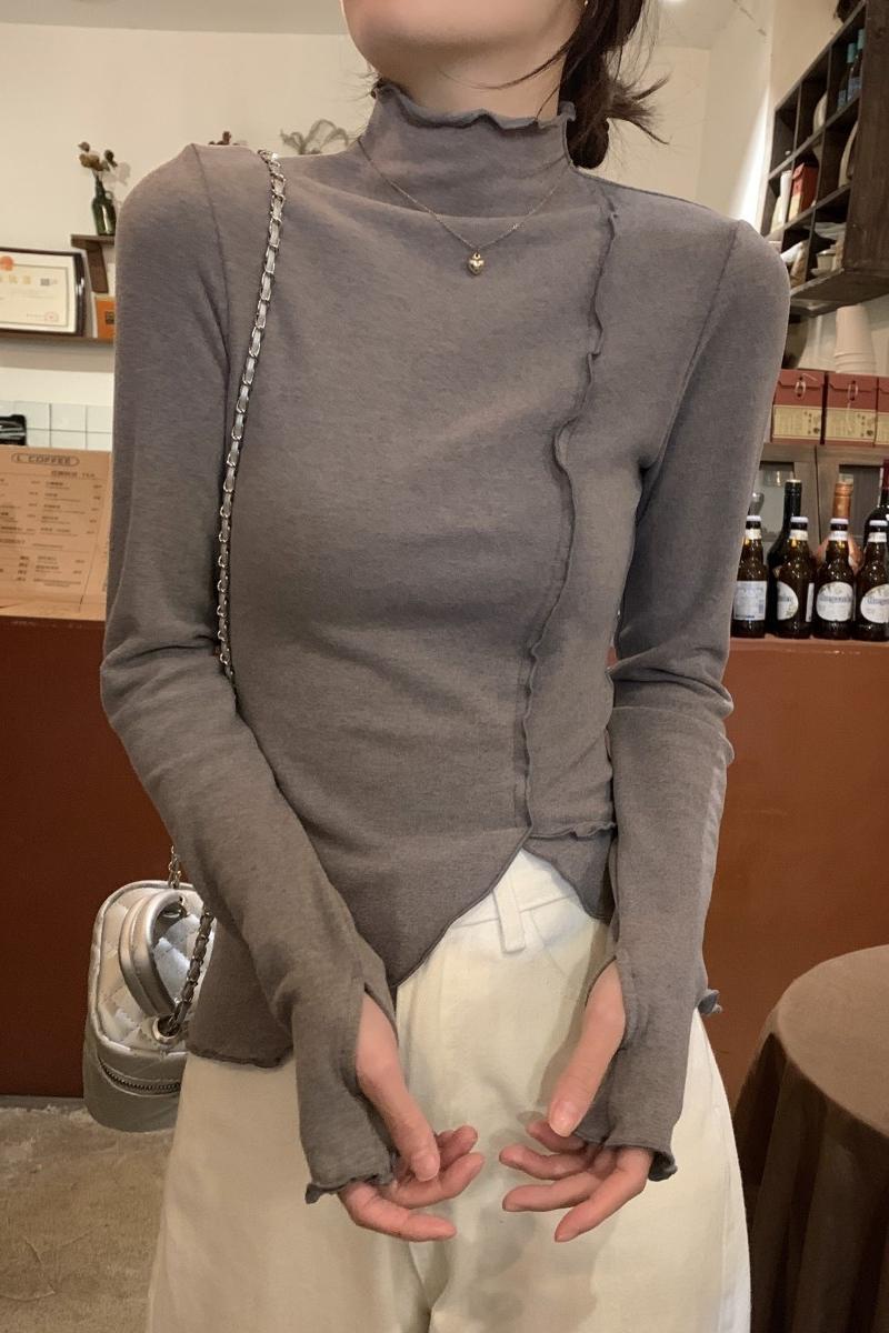 한국 스타일의 둥근 목 복합 이중층 벨벳 두껍게 파운데이션 내부 셔츠 티셔츠 여자 탑